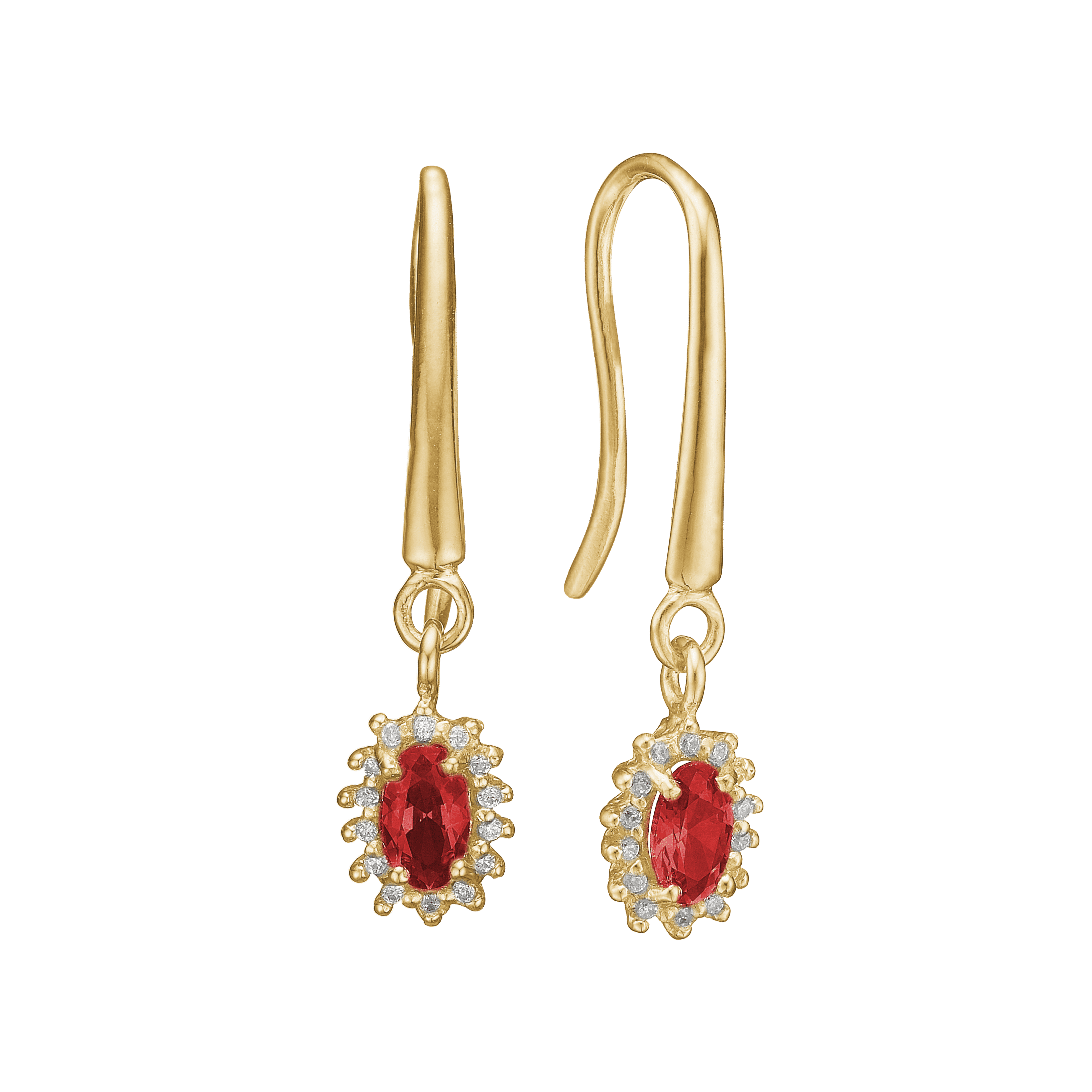 Flotte øreringe med en oval rubin, omkranset af små fine diamanter. Øreringene er i 8 karat guld og har en længde på 25 mm incl. ørebøjlen.