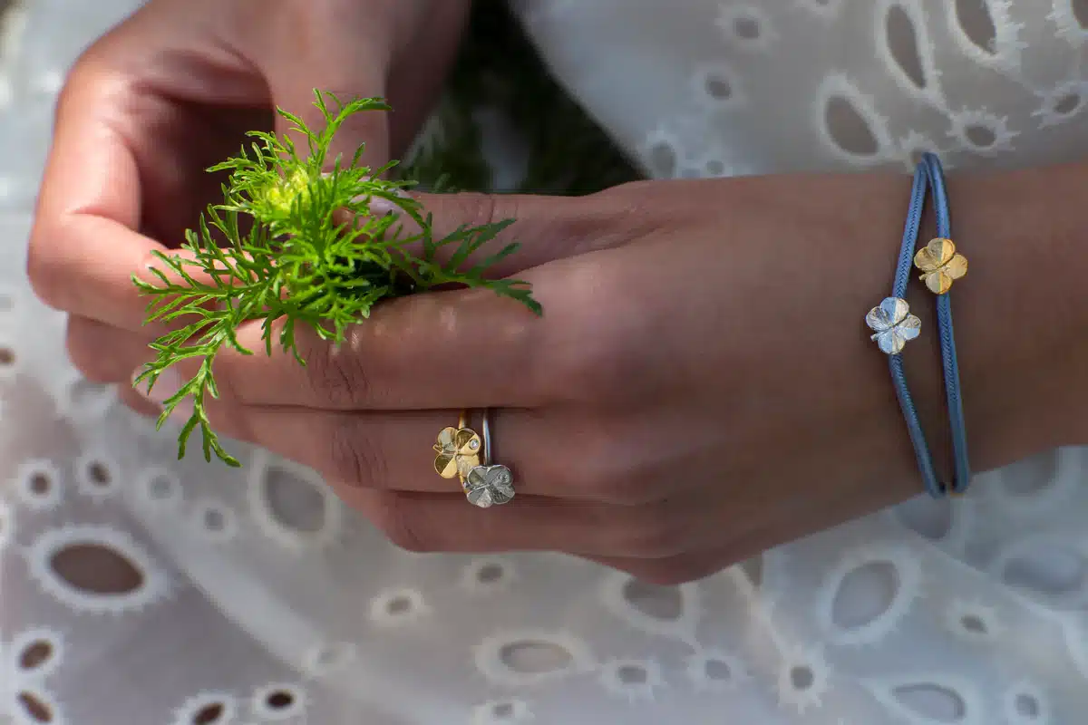 Firkløveret i armbåndet blev plukket i Danmark i 1950’erne og hver af de fire blade repræsenterer noget særligt: tro, håb, kærlighed og held. Det er sjældent at finde en firkløver, da kun én ud af 10.000 kløvere har fire blade.