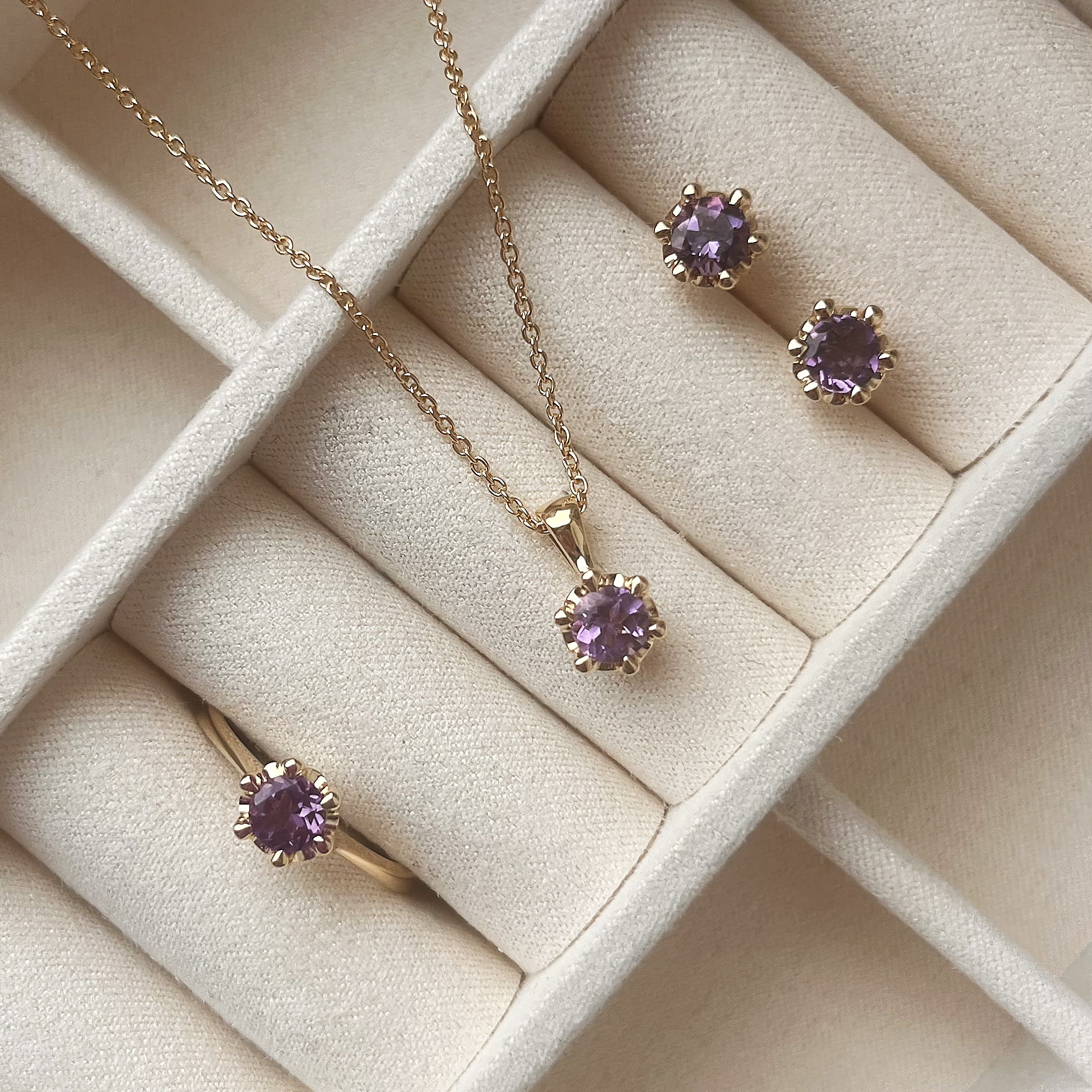 Denne elegante ring fra Scrouples er lavet i 8 karat guld og har en smuk lilla amethyst som centrum. Ringen har et enkelt design, der gør den nem at bære til både hverdag og særlige lejligheder.