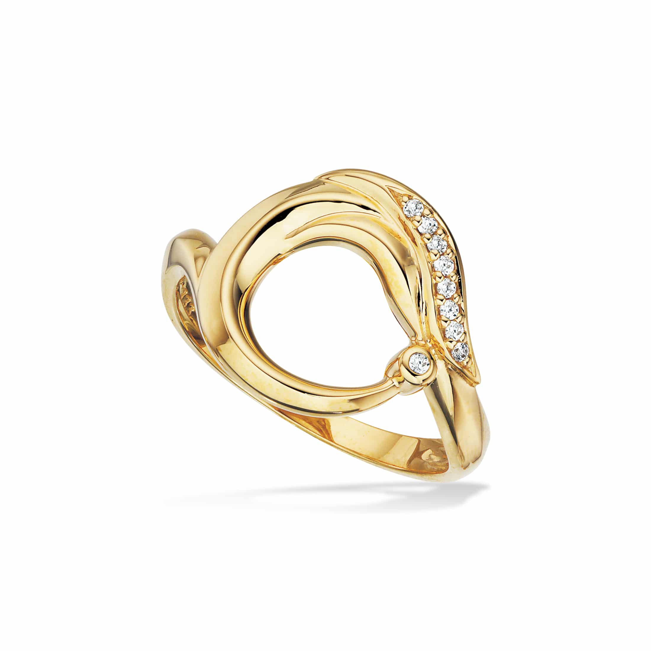 Klassik 8 karat blank guldring med en åben cirkel, hvori der er isat en række små glimtende zirkoner.