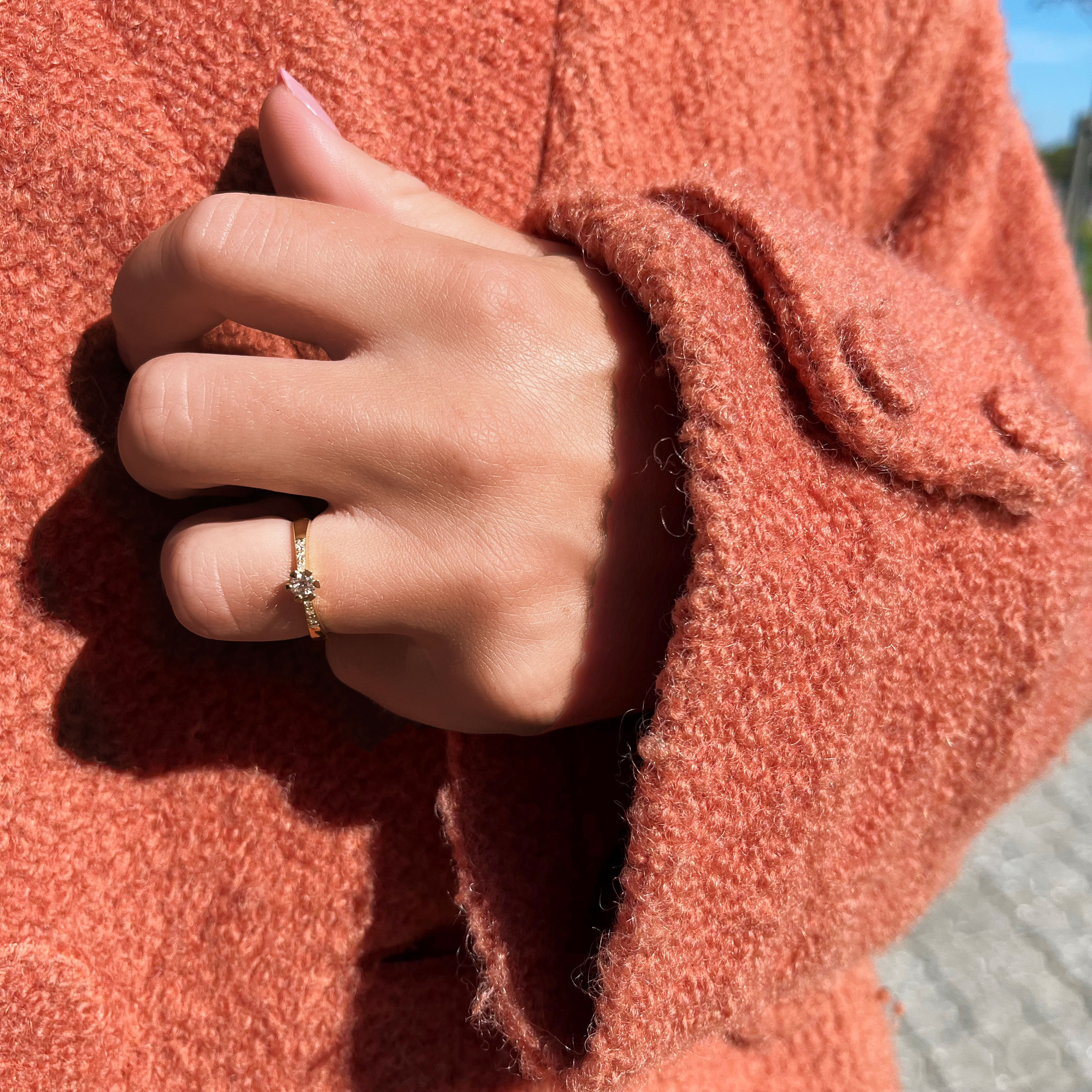 Vida Darling ringen fra Scrouples, en klassisk og elegant diamantring, udført i blankt 8 karat guld, på toppen af den smukke ring er en brillantsleben diamant på 0,20ct H-W/pi, langs siden på begge sider af ringen, er der isat tre diamanter på talt 0,04ct H-W/pi.
